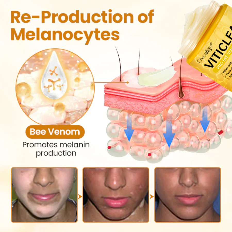 Oveallgo® VitiClear Pro Krem z Jadem Pszczelim jest wzbogacony o wysoką aktywność PLA2, aby pomóc tłumić tę nieprawidłową odpowiedź immunologiczną, chronić melanocyty i stopniowo przywracać naturalny koloryt skóry.