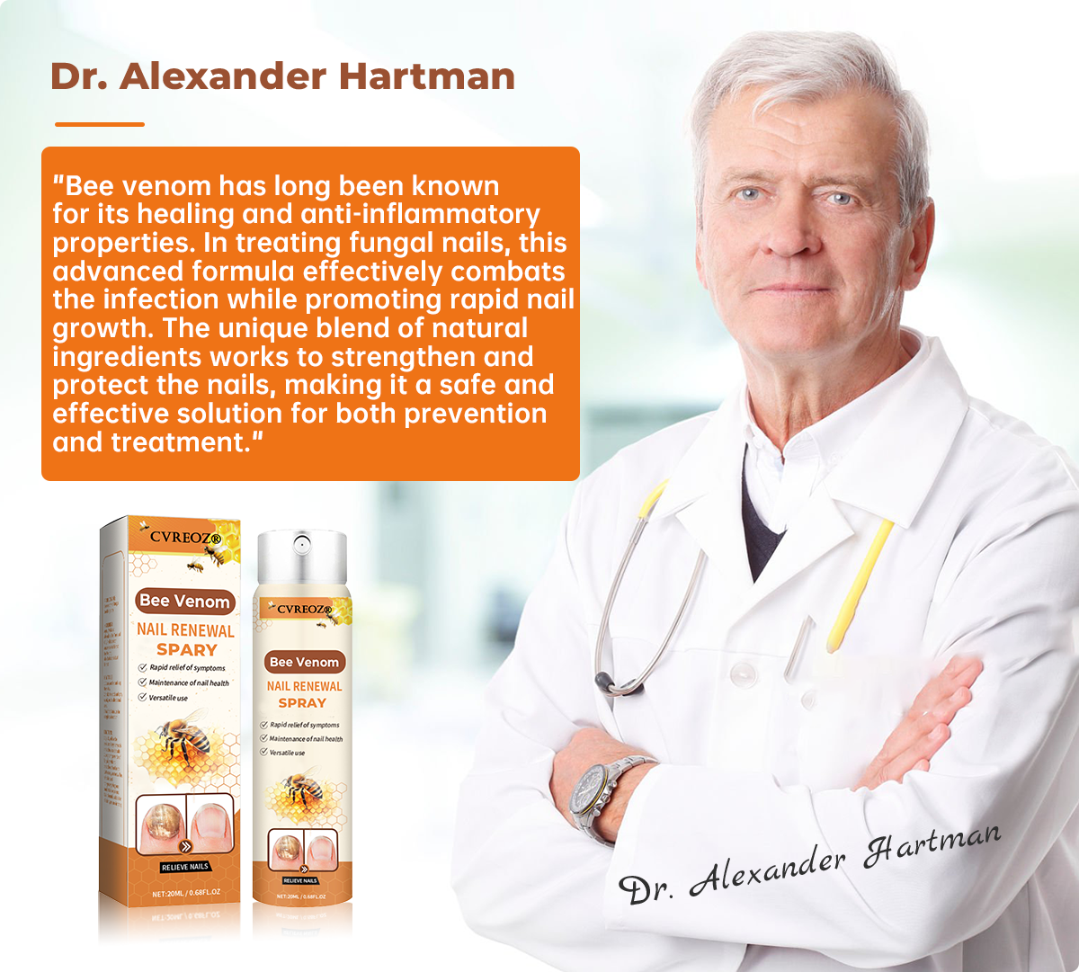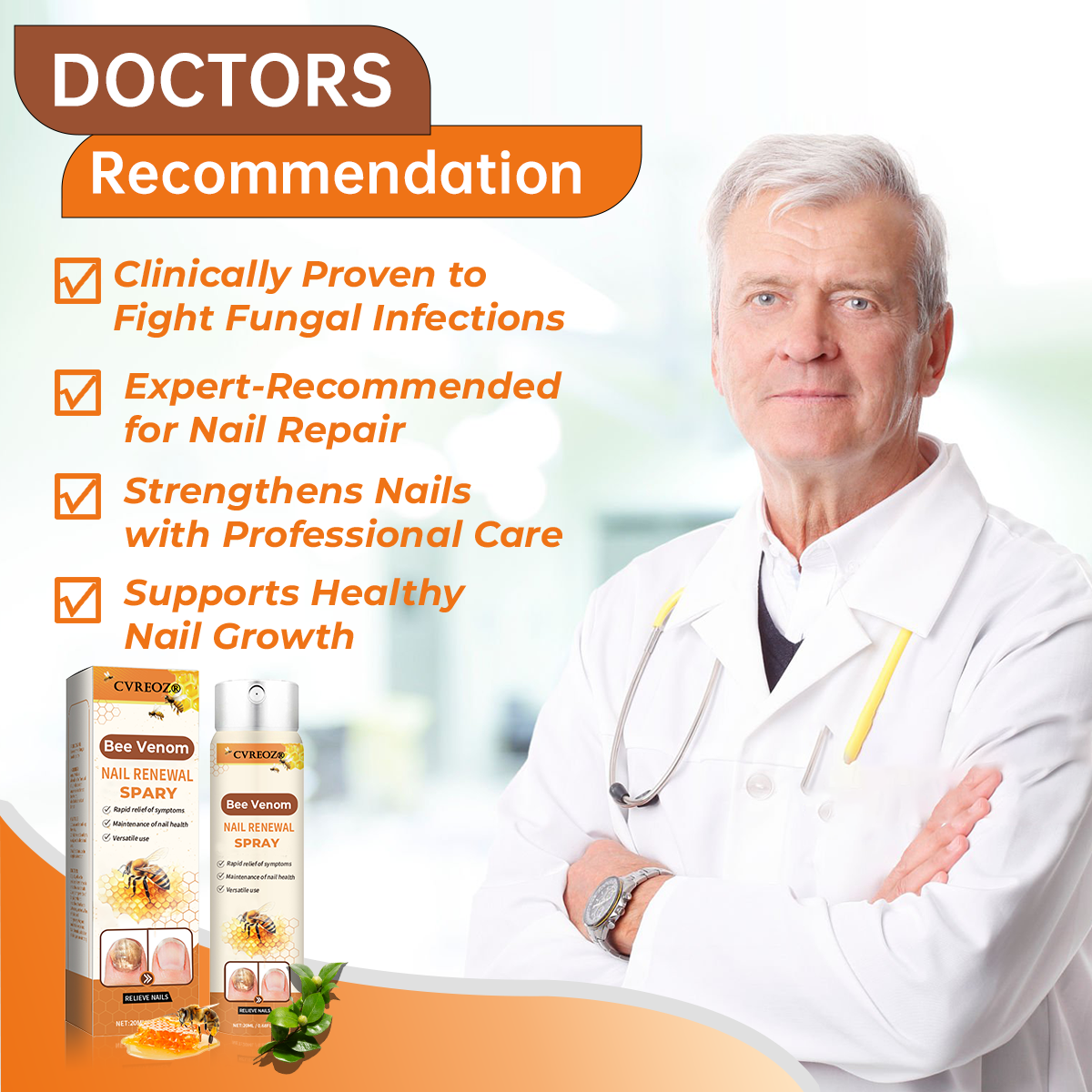 Dermatologists have consistently recommended the advanced formula of CvreozยฎBee Venom Nail Renewal Spray, which has been clinically verified to combat stubborn fungal infections and promote comprehensive nail repair through its triple mechanism of action: The medical-grade antifungal properties during treatment can effectively eliminate pathogens. Its keratin-enhanced complex repairs and strengthens damaged nail structures, and its growth-promoting formula supports healthy regeneration - making it a professional choice for therapeutic interventions and preventive nail care. Clinical studies have shown that after regular use for four weeks, both the integrity and appearance of nails have significantly improved.