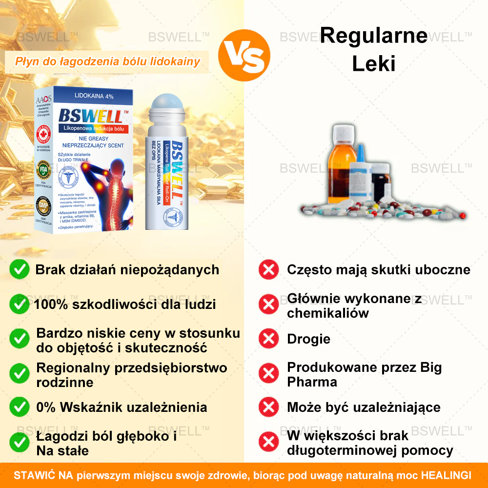 W takim razie nasz Lidokainowy Łagodzący Ból w Rolce Żel do ulgi w bólu jest idealny dla Ciebie! Ściśle współpracowaliśmy z czołowymi ekspertami w zakresie zarządzania bólem i naprawy skóry, aby opracować rewolucyjny produkt, który wykorzystuje silne właściwości łagodzące ból i leczące lidokainy. BSWELL™ Lidokainowy Łagodzący Ból w Rolce Żel o maksymalnej sile działania to idealny booster, który pomoże Ci zwalczyć różne bóle i niedogodności, pozwalając Ci żyć bez bólu i cieszyć się komfortem oraz witalnością każdego dnia.